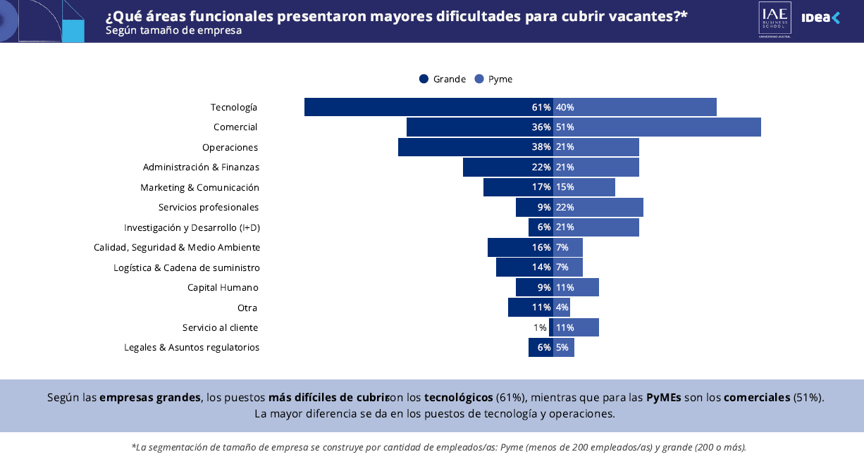 Los puestos vinculados a tecnología (49%) y comerciales (45%) son los más difíciles de cubrir. Las empresas grandes son las que enfrentan mayores complicaciones en la búsqueda de posiciones vinculadas con tecnología (61%), mientras que las PyMEs identificaron su principal obstáculo en las posiciones comerciales (51%).