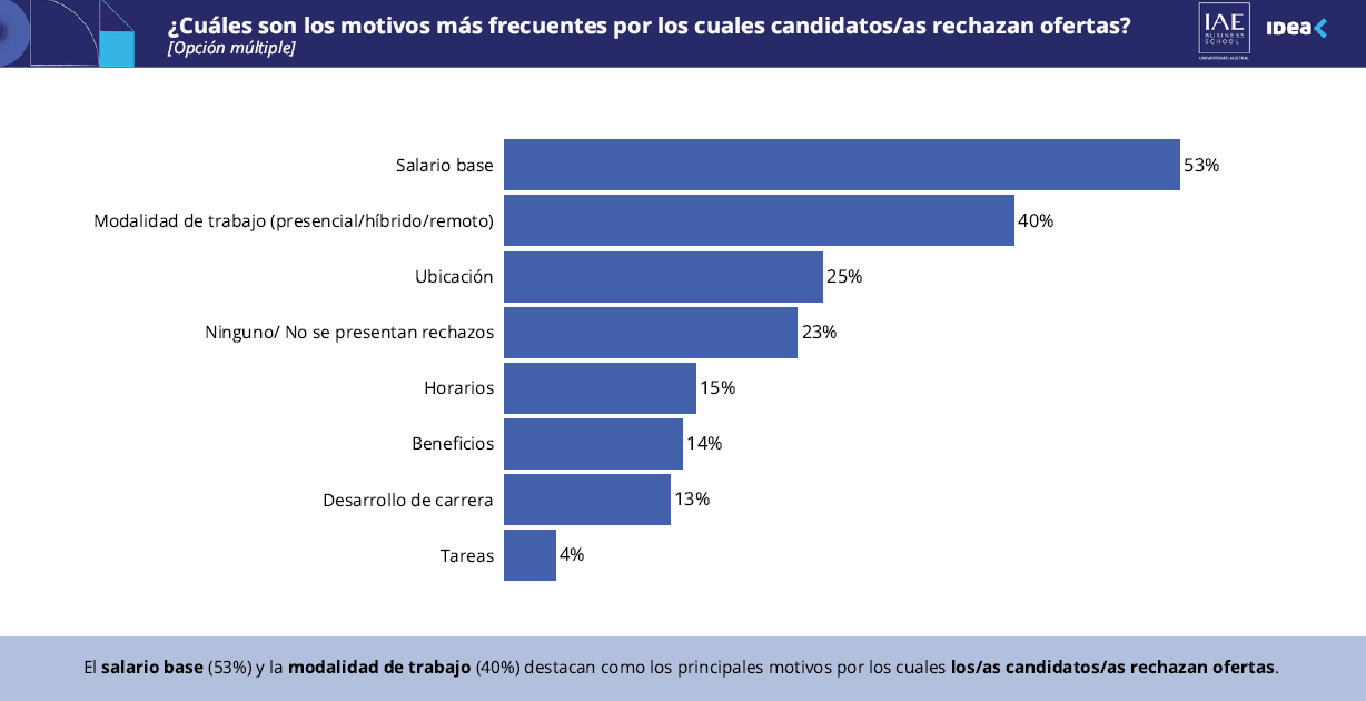 Desde el lado de los candidatos, el salario base (53%) y la modalidad de trabajo (40%) surgen como los principales motivos por los cuales rechazan ofertas laborales, con preferencia por los trabajos en modalidad híbrida o remota.