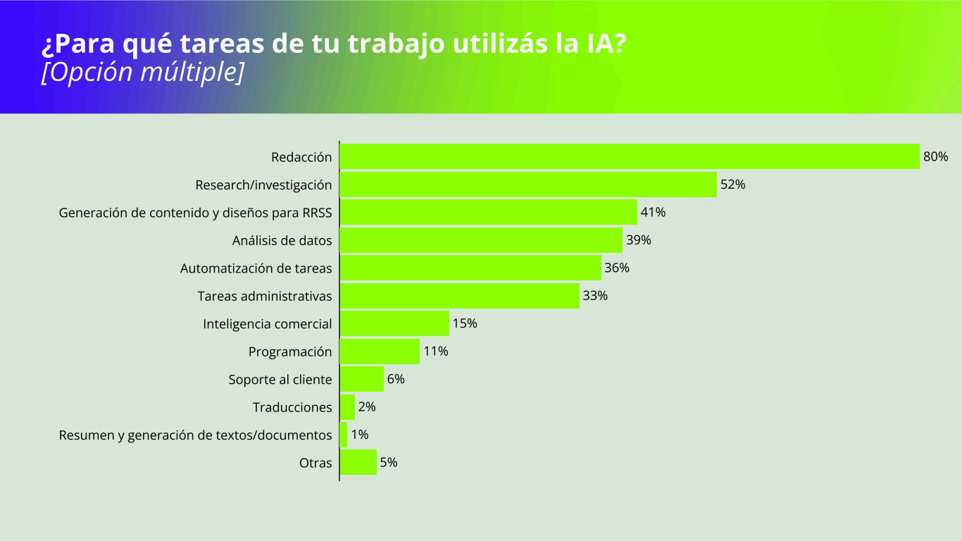 El 42% de los encuestados destacó que usa IA todos los días en su ámbito laboral, principalmente para tareas como redacción, investigación, generación de contenido y diseño para redes sociales y análisis de datos. Pero, en muchos casos, se trata de una decisión individual: solo el 67% de los profesionales consultados trabaja en organizaciones que impulsan el uso de IA.