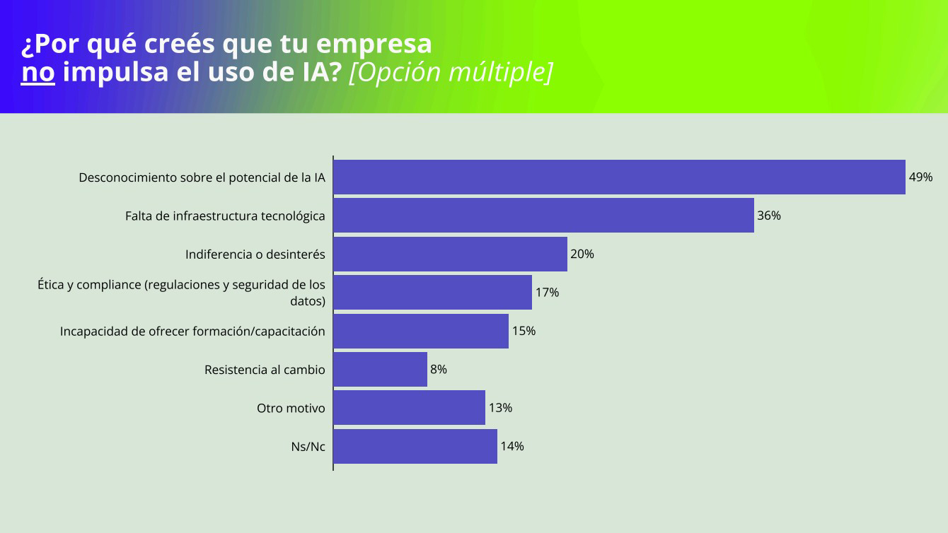 Otros motivos por los cuales las empresas no fomentan el uso de la IA entre sus empleados son la falta de infraestructura tecnológica (36%); indiferencia o desinterés (20%); ética y compliance por regulaciones y seguridad de los datos (17%); incapacidad de ofrecer formación y capacitación (15%) y resistencia al cambio (8%).